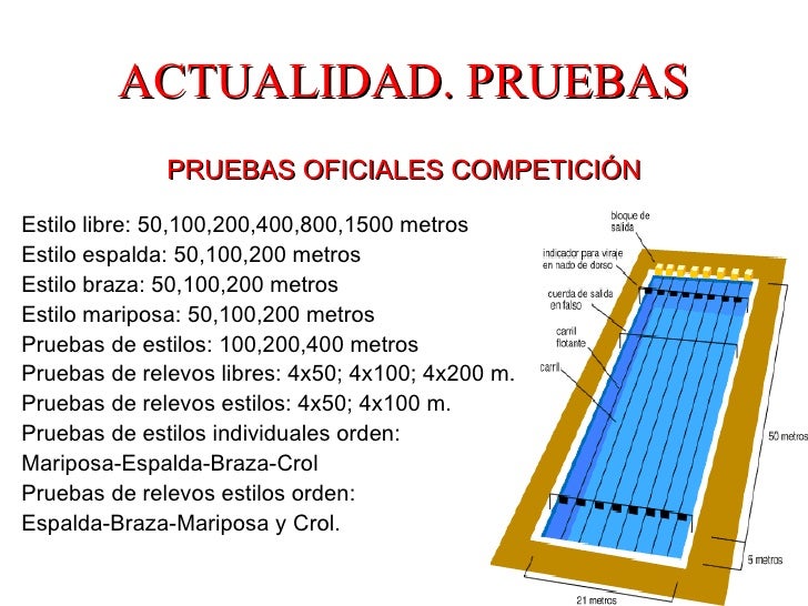 Las pruebas de natación se dividen en estilos, metros y si se nadan en piscina tanto de 25 metros o de 50 metros.